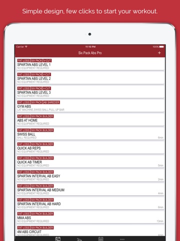 Six Pack Abs Workouts offers many different workout types (BBG, HIIT, high intensity, beginner, intermediate, advanced, etc.) each of which displays the intensity level of the workout.