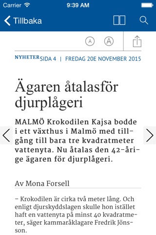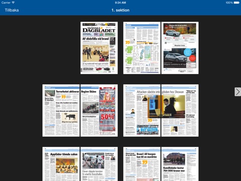 Du får hela tidningen med sina två delar. Du kan bläddra, zooma och söka i tidningen. Dina köpta tidningar sparas i ett bibliotek i appen. Dagens tidning går att hämta redan från kl 00.00 svensk tid.
