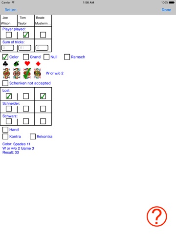 The Skat Score Pad App is then the right thing for you: This App helps you calculating and keeping scores, distributing the scores by email and some other features.