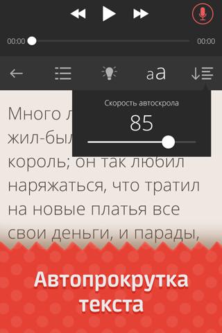 - Автопрокрутка текста сказки с регулируемой скоростью;