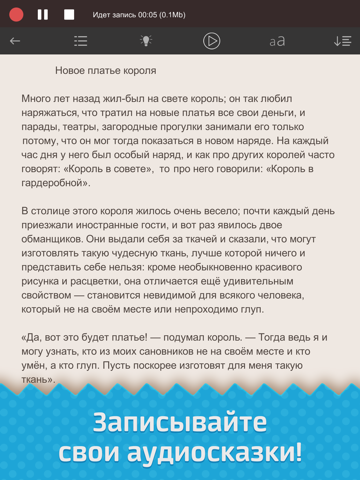Читайте, слушайте и записывайте аудиосказки! Простой и удобный интерфейс - ничего лишнего.