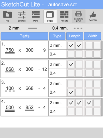 - automatic calculation of the area of parts and pieces, cut length, the length of the edges;
