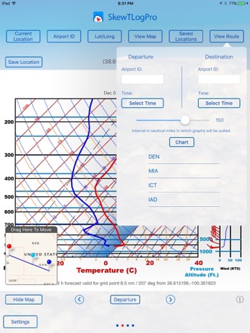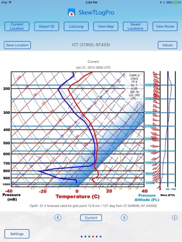 SkewTLogPro gives you one-touch access to powerful skew-t log-p charts. View charts using your current GPS location, airport ID code or lat/lon. Each skew-t log-p chart provides a visual indication of temperature, dew point, winds aloft, and wind speed at various altitudes.