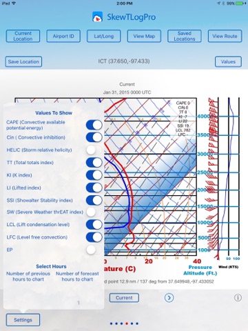 • View many values such as CAPE, LI, LCL, and many other options through settings