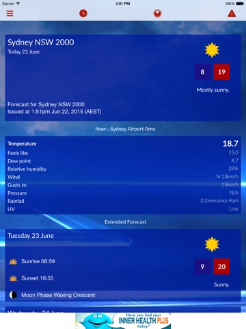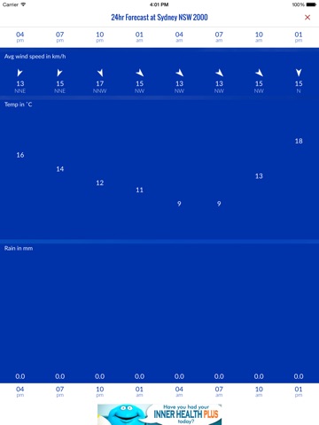 I saw almost immediately that this app was Australian and decided to get it anyway out of curiosity. You get about three maps, depending on "rain"- Queensland only I think, "cloud cover"- all Australia , and ?- all Australia. Seems town name or post code based, some of the names on "rain" map got no results, typing in 4000 gets anything in Australia with a 4000 based code (Id need a list of post codes but that might not be practical), other 1000s the same way. Forecast results in C° and mm. Worth more to an Australian than anyone else.