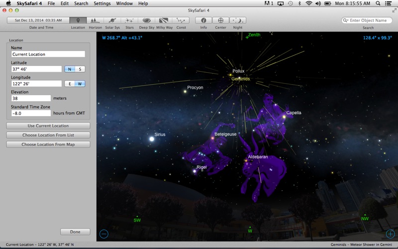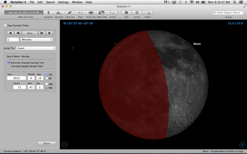 Koordinaten werden nur als Länge/ Breite angegeben. Wenn man ein Teleskop mit äquatorialer Montierung hat, braucht man aber Rektaszension und Deklination. Bei anderen Programmen, z. B. RedShift und Stellarium ist es kein Problem, sich die Koordinaten anzeigen zu lassen, die man braucht. Uhrzeiten kann man nur mit AM/PM angeben. Wie umständlich ist das denn? Man kann nachlesen, ob man ein Objekt mit einem „großen“ oder „kleinen“ Teleskop beobachten kann. Interessanter wäre es, wie ein Objekt mit einem bestimmten Teleskop und Okular zu sehen ist. Schön ist dass man sich Planeten von nahem ansehen kann. Aber bei Redshift kann man ein beliebiges Objekt, egal ob Planet, Mond oder Galaxie von allen Seiten ansehen, indem man es dreht. Bei RedShift und Stellarium kann man auch zum Ausgangspunkt zurückkehren, nachdem man sich einen Planeten von nahem angesehen hat. Mit SkySafari 4 kann man das nicht so einfach. Selbst das Zoomen ist erheblich umständlicher als bei RedShift und Stellarium. Ich hatte erwartet, dass Sky Safari irgend etwas bietet, was die beiden anderen Programme nicht (so gut) können. Dabei bin ich sehr enttäuscht worden.