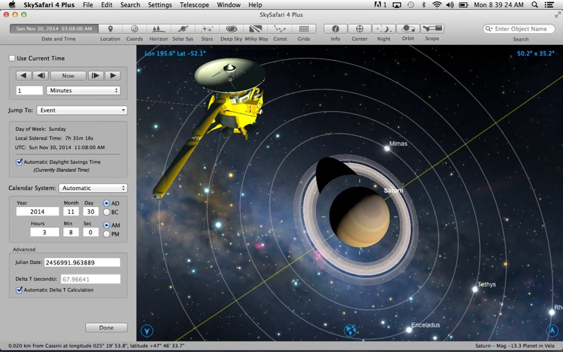 Like our SkySafari iOS apps, SkySafari for Mac OS X comes in three versions, Basic, Plus and Pro. This version, Plus, includes 2.5 million stars, 31,000 deep sky objects, the Solar Systems major planets and moons, and over 4,000 updatable asteroids, comets, and satellites. Simulate the sky from any place in the Solar System, up to 10,000 years in the past or future. Expand your astronomical knowledge with over 1500 encyclopedic descriptions of the constellations, stars, and planets. Enjoy more than 800 images from NASA space missions, the Hubble Space Telescope, and the worlds foremost astro-photographers.