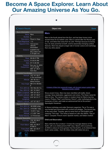 Learn about the history, mythology, and science of stargazing! Browse from over 1500 encyclopedic object descriptions and astronomical photographs. Explore tons of NASA space missions! Stay up-to-date with SkyWeek, for all major sky events every day – miss nothing!