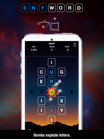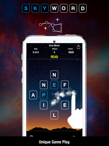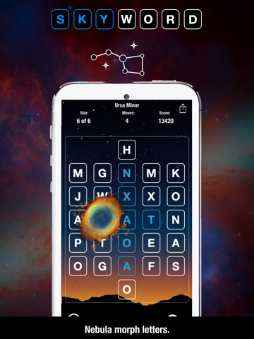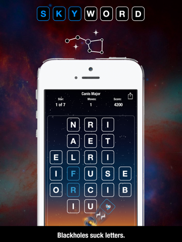Revolutionary word play design. Clear letters to form star formations that create constellations. Discover our skys constellations while forming and finding words. Inventive gameplay includes: (patent pending) unique word find, letter bombs, wildcards, blackholes and asteroids. Out of this world game play!
