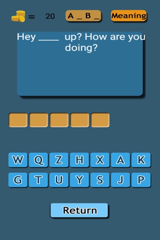 Slang Words Game - Part 1, an intermediate level word game consisting of various slang, informal and trendy words along with idioms, sayings, and expressions for you to solve. Simply guess the missing word and just keep in mind that the word should be a slang, so think informally.