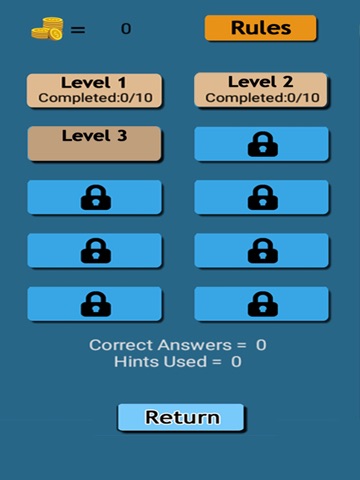 There are over 100 questions, total of 10 levels for you to solve in this game. If you get stuck, there are 2 types of hints to use. Coins will be deducted each time you use a hint, and coins are added whenever you get a correct answer. The best of all, it is 100% free. Have Fun!