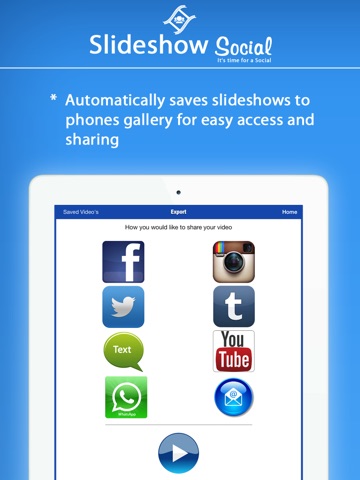 * Share videos on Facebook, Instagram, Twitter, WhatsApp, Tubmlr, Email, or Text