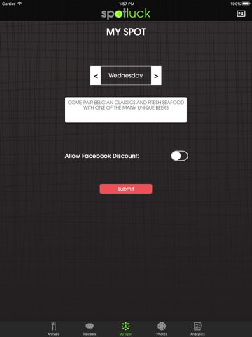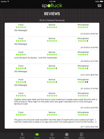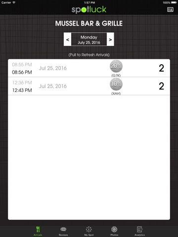 The Spotluck Merchant App is a live communication channel that allows merchants to customize when and how they are viewed by Spotluck users. It also gives merchants real-time information on Spotluck arrivals, reviews/ratings, and data analytics. To access your account, download the app and log in using the credentials provided by Spotluck.