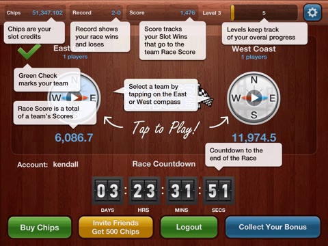 Slots Race offers a free online slots experience for iPhone and iPad with an added twist: competition with friends and fellow users. In Slots Race, users spin to win chips that they earn for one of two rivalry teams. And with current match-ups: Frosty vs Rudolph & East Coast vs. West Coast, we know youll have a favorite team.
