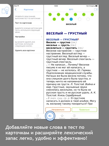 • НОВИНКА! Для просмотра целого текста скопируйте его в любом приложении, переключитесь в словарь и смотрите статьи всех доступных слов этого текста.