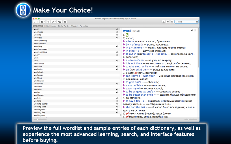 Now you can make sure that a dictionary complies with your language level and contains all words you need before purchase. Full-fledged versions are available for buying with the in-app dictionary catalog.