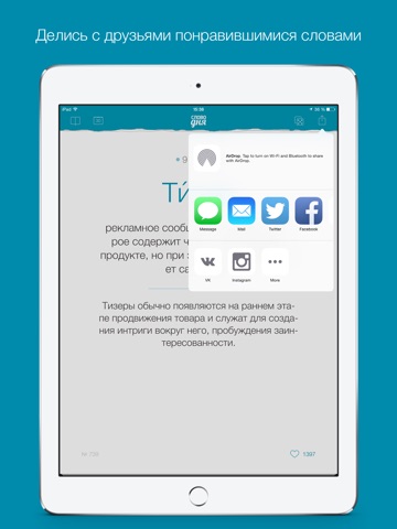 √ шаринг слов в Facebook, Instagram, Вконтакте, Viber и т.д.