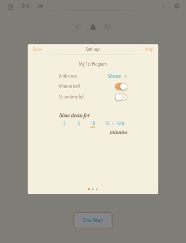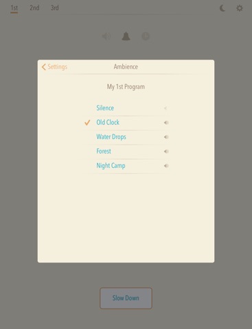 Slow Down can be set to 1 - 60 minutes of rest and there are four optional ambience sounds: