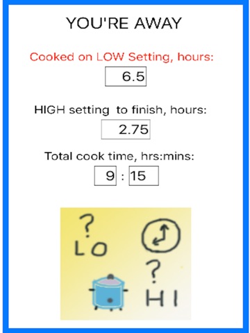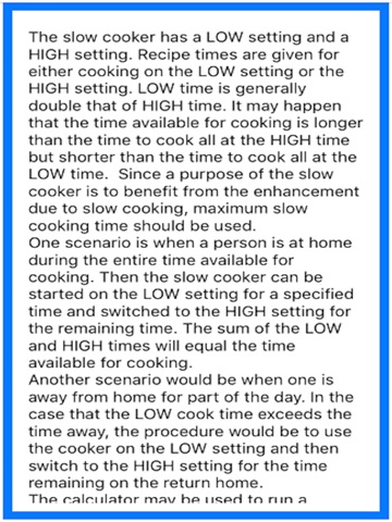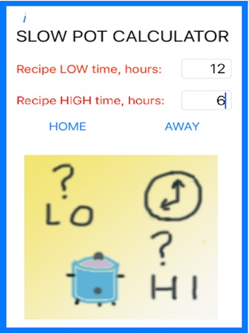 SlowPot app calculates the mixed times of LOW and HIGH settings when using a slow cooker. This allows for maximum slow cooking while remaining within a reasonable total time. Recipes are normally given in terms of a total time on LOW or a total time on HIGH; this may not be convenient. SlowPot app provides the information for more convenient management of the required cook time.