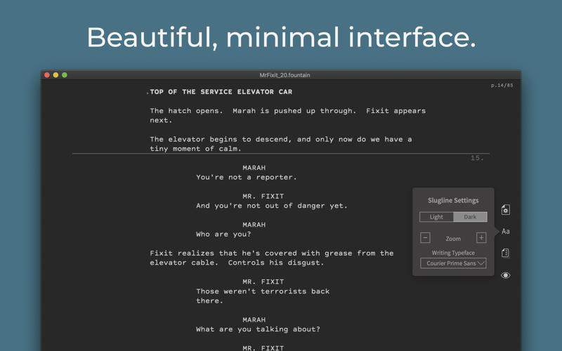 Slugline 2 is based on Fountain, the plain-text screenplay format that’s free and open for all to use. The screenplays you create with Slugline 2 can be opened on any computer, using any writing app — because they are just text.