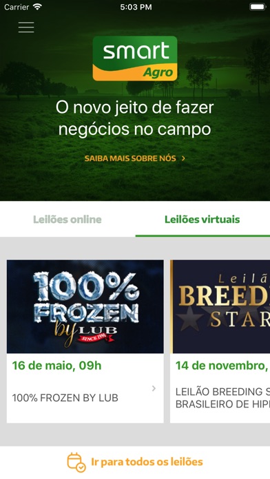 A Smart Agro é uma maneira segura e prática para você, criador, concretizar vendas com segurança e transparência! E para facilitar os seus negócios, agora você pode participar de nossos leilões a partir de transmissões ao vivo de leilões virtuais pelo aplicativo Smart Agro! Além disso, também é possível realizar lances, acompanhar as agendas de leilões, eventos e todas as novidades do agronegócio!