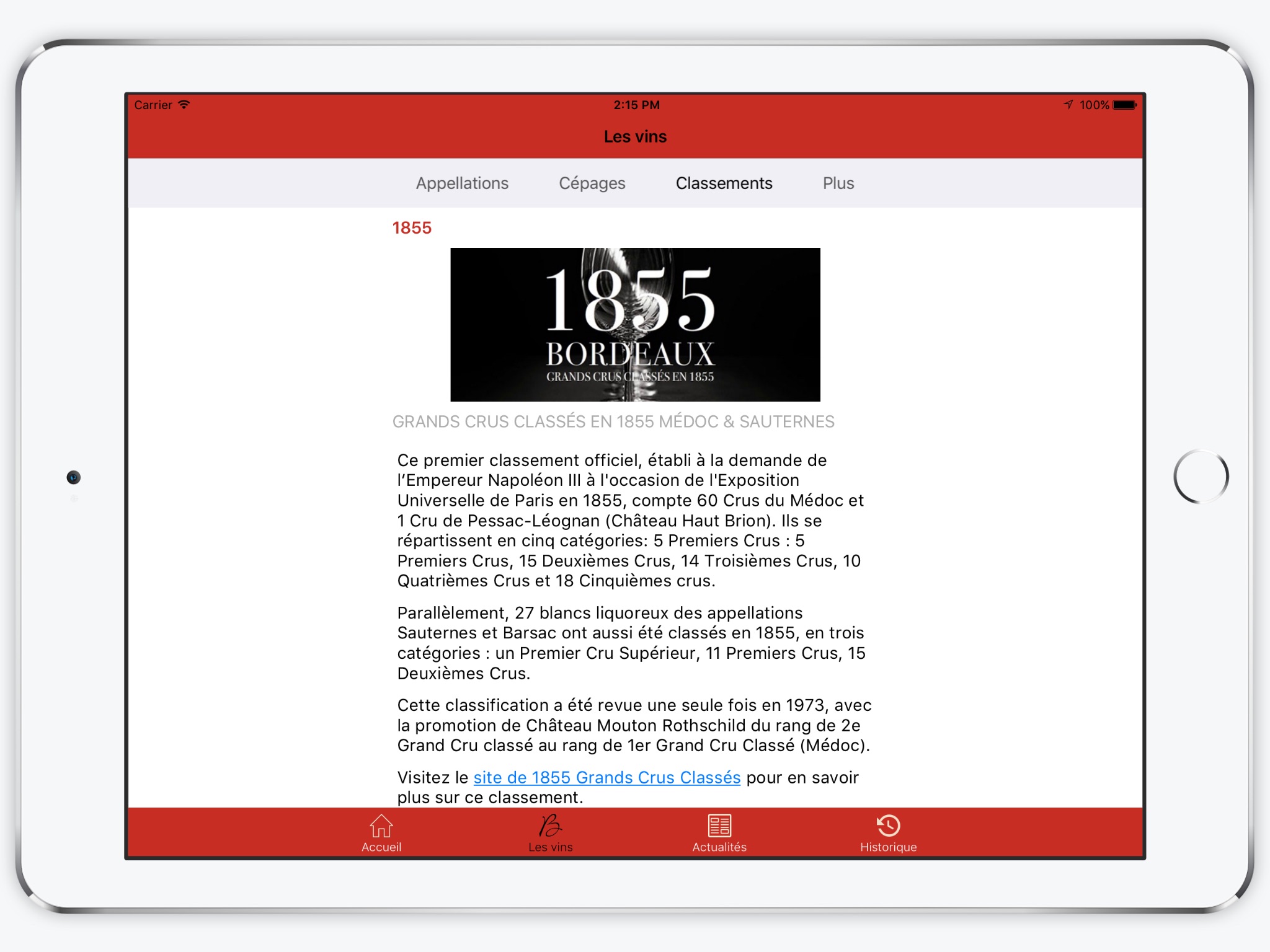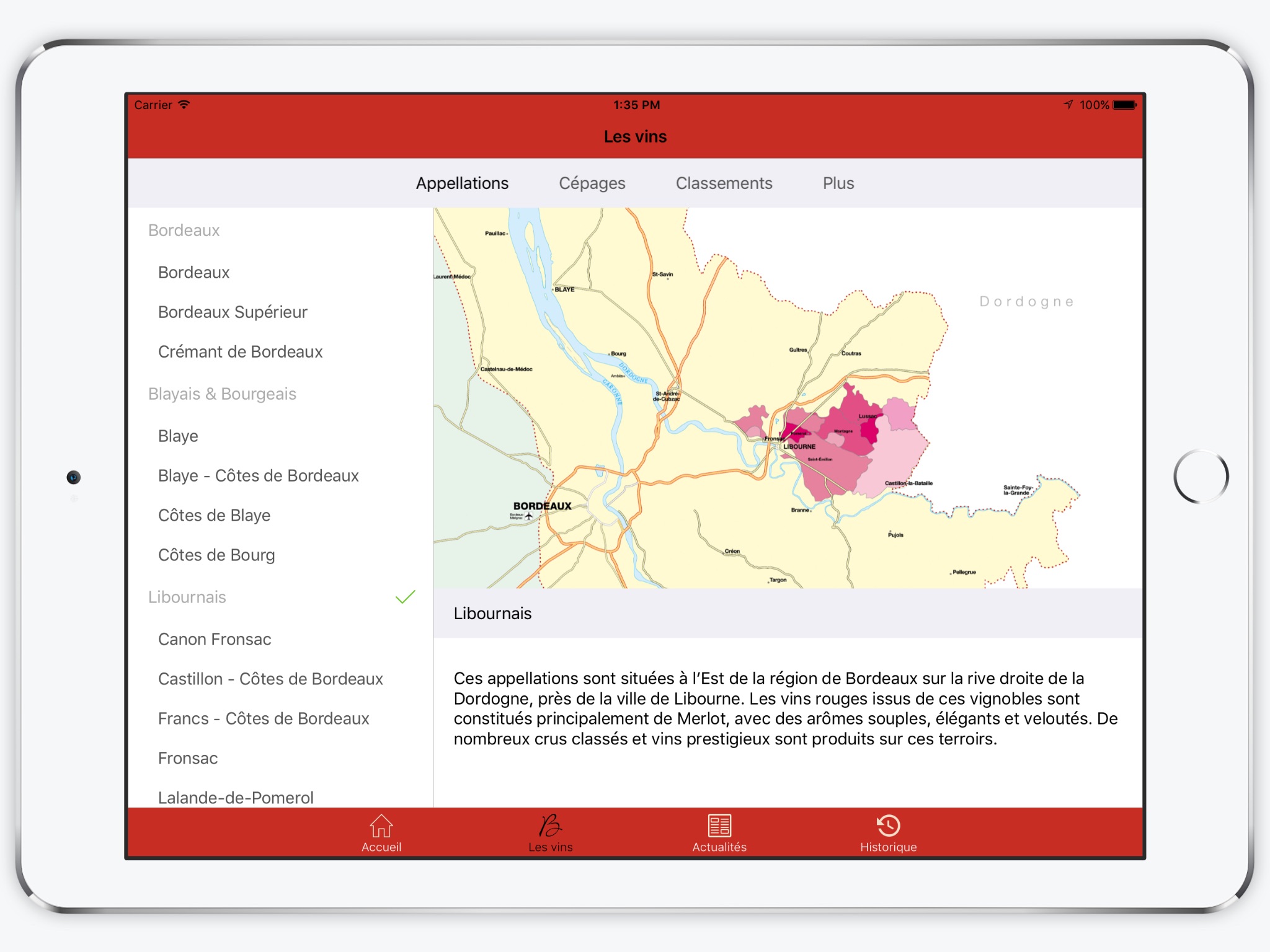 Ça fait 3 mois que je l avais vu en cours de développement sur une chaîne tv locale. 3 mois dattente pour voir enfin la merveille. L apps la plus complète et la mieux réalisée sans volonté de vendre et en plus gratis.Sponsorisée grace a l Europe avec la participations du syndicat des vins et des proprio de vins de bdx. Les coordonnes des proprios, leurs mains et même localisation sur la carte ou le potentiel de garde Quelques petits vifs sur les fiches sinon ça aurait été 5etoiles