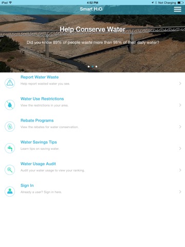 The easy, fast and FREE way to conserve water and be a part of the solution to the California drought! The Smart H2O app gives you the ability to report a leak or water waste in as little as 15 seconds with the snap of a picture. Smart H2O also provides you with water conservation tips, local rebates to earn money, and a free quiz to see how your conservation skills rank amongst other water heroes. Download the app now for FREE!