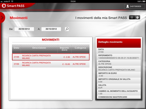 - Ricarica del numero di telefono Vodafone associato alla Smart PASS