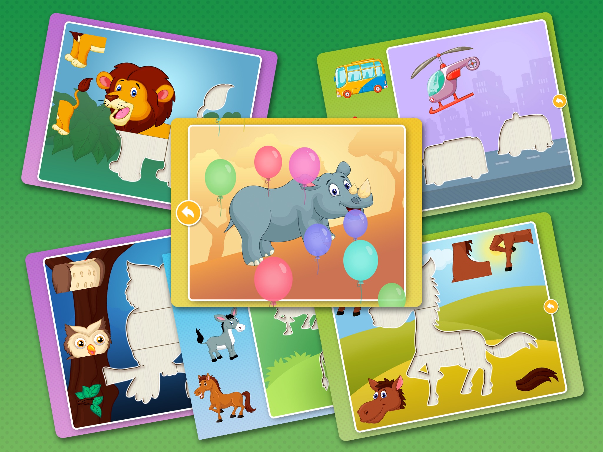 Smart Puzzles is a cheerful educational app for children from 2 up to 3-4 years old! The game includes over 30 colorful puzzles with bright pictures of animals and vehicles.