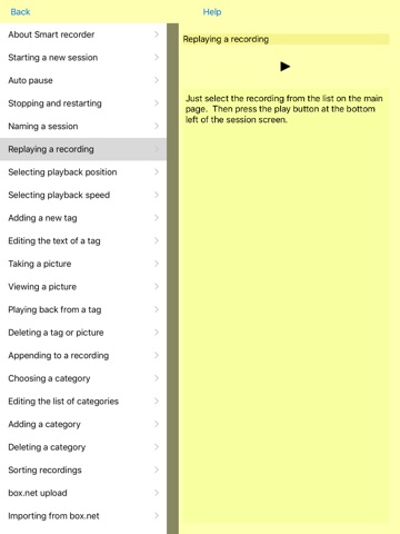Pour devenir plus fonctionnelle, il serait souhaitable de : - pouvoir effacer le terme "session 1" en une fois pour personaliser le titre de la session et avoir un champ vide pour éditer un tag sans être obligé a chaque tag deffacer le mot tag ( trois touches de clavier) - classer les sessions par titre, date, prioriter - avoir la possibilité de faire des catégories de sessions - avoir la possibilité de faire une boucle entre les tags ou de toute la session.