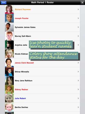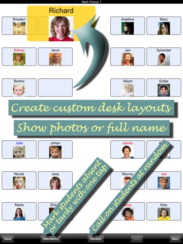 This app lets you create seating charts with desks on a grid, record and export attendance, choose random students for class participation, make student notes, and store student photos all in one place. Move students around by dragging and dropping students. Generate a PDF version of your seating charts (with photos) as a backup or to give to substitute teachers. Take role easily by tapping on absent, tardy, or excused students. Create spreadsheets of your class attendance records and then easily transcribe the records to your schools attendance system. Load student photos to help you quickly learn student names. Make notes about each student. Export student records to e-mail. Create a custom desk layout by starting with a grid pattern that you choose, then hide selected desks. Go paperless!