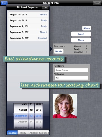 ● Tap on a student to access attendance history, notes, and to load a photo using your mobile devices photo album or camera.