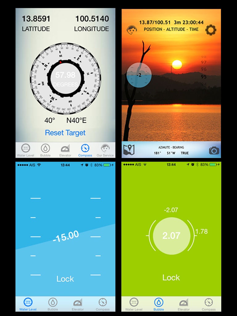 Hold device flat relative to the ground to use as a 360-degree bubble level tool, or hold device vertical to the ground to use as a horizon bubble level tool.