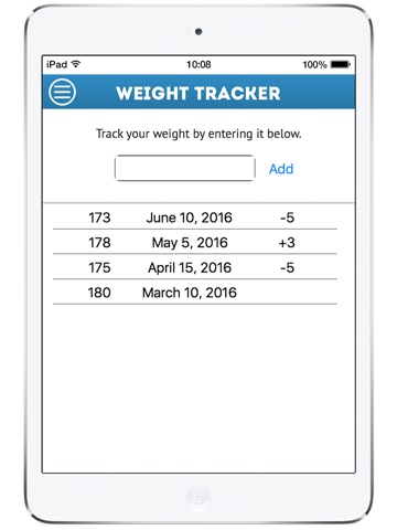 We know how important it is to track your weight during your fitness journey and weve add an easy to use weight tracker. Just enter your weight, tap add, and start tracking! If youve added one by accident, no problem! Just swipe left or right on the weight to remove it.