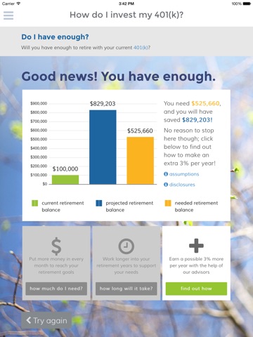 Are you confused about investing in the stock market? Unsure how you’ll provide yourself with enough money to live comfortably in retirement? Receiving professional investment advice for your work retirement plan shouldnt take hours of preparation and time-consuming meetings. With just a few minutes of your time, Smart401k calculator gives you the personalized 401(k) advice you need to invest comfortably in the markets and manage your money with confidence.