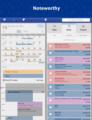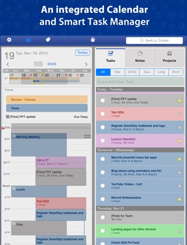 SmartDay integrates a Calendar, Tasks, Notes, and Projects all into a single application. SmartDay runs on your iPhone, iPad or iPod Touch. Separate SmartDay apps are available for Mac OS X and on any browser, so you can access your most up to date information all the time, anywhere.