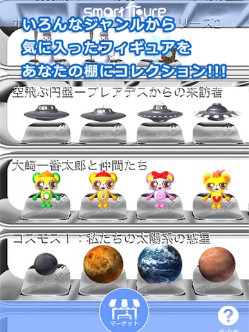 ▼Upon launching the app you will see a shelf you can use to arrange your figures. The shelf is empty aside from a few sample figures. From the shelf screen, you can select "MARKET" to open the Figure Market, which lets you get new figures. There are all sorts of figures, including both free and paid ones.