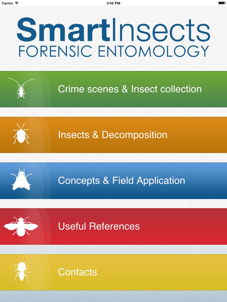 SmartInsects is divided in sections such as: general concepts, insect pictures, guidelines for sampling and storage of insect material and collection of environmental data. Moreover, useful references and contacts are provided. This app is purely designed to guide the crime scene technician or proxy for collecting and preserving entomological samples. App updates with translation into different languages will be become available after further input from the entomological community.