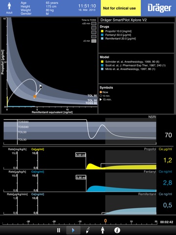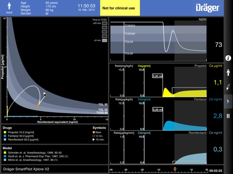 Dräger SmartPilot® Xplore intelligently displays current and future anesthesia levels on an easy to grasp 2D diagram. Based on pharmacokinetic and –dynamic models, you can see effect site concentrations of anesthetic drugs already administered and their combined effect even with a 15 minute prediction.