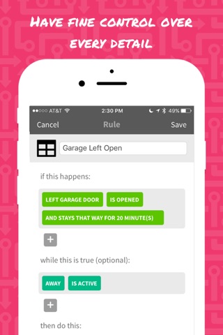 SmartRules lets you easily create rules for SmartThings, so you can finally make your smart home smart! No more struggling to search through the published SmartApps to find something that meets your needs, or worse yet, trying to write the code yourself. With SmartRules, you just specify what should happen, when, and it does the rest.