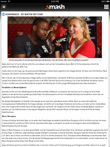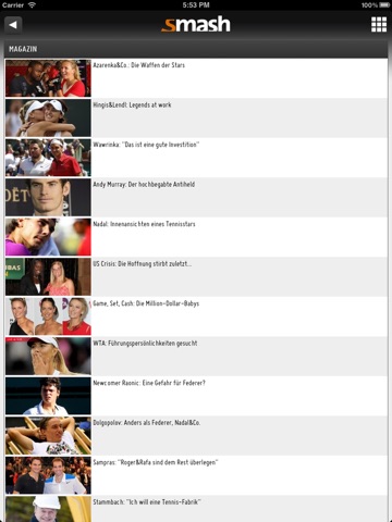 Die smash.ch Tennis iPhone-App ist perfekt für unterwegs! Die smash.ch iPhone-App informiert Sie laufend über das aktuelle Geschehen aus der Tenniswelt. Sie haben überall schnellen Zugriff auf die Tennis News und verpassen keine Live-Tennisspiele mehr! Dank dem smash.ch Live-Ticker sind Sie in Sachen Tennis stets live mit dabei!