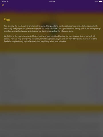 The ultimate Super Smash Bros companion app, whether you play casually or competitively, Ultimate or Melee. Find and watch live or prerecorded tournaments, read and watch guides to improve your play, and peruse your characters frame data to learn more.