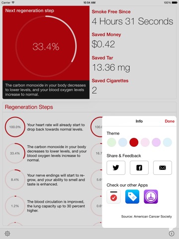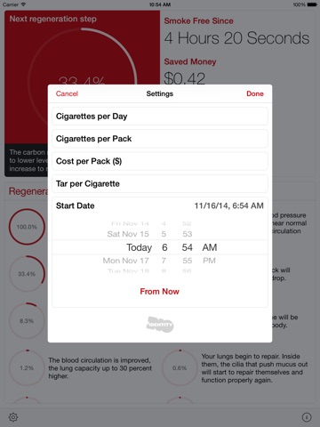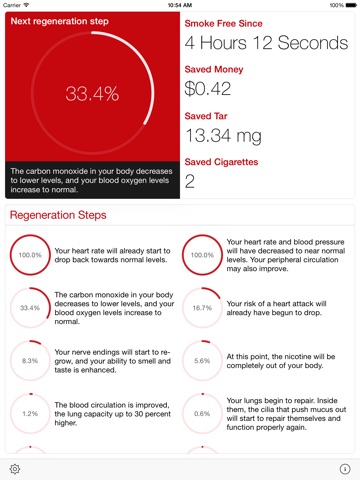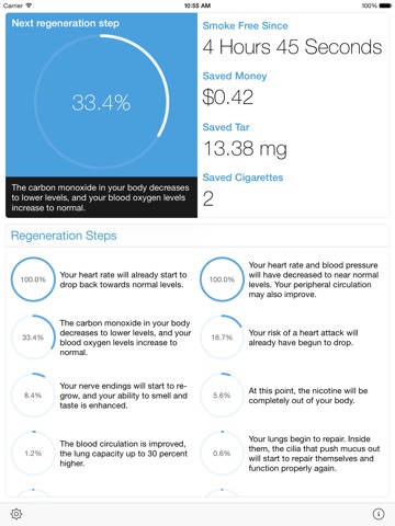 With Smokefree you will take the first step towards a healthier life. Smokefree will show you how much money you have saved and how much tar and how many cigarettes you have avoided and what regenerative steps your body has made since you quit smoking.