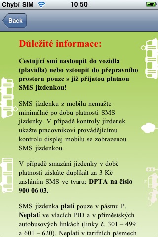 Jízdenky na pražskou městskou hromadnou dopravu ve vašem mobilu! Oficiální aplikace Dopravního podniku hlavního města Prahy. Rychlé a pohodlné pořízení jízdenky. Pokud používáte různé druhy jízdenek, pak je tu pro vás aplikace nabízející všechny typy v současnosti nabízených SMS jízdenek. Podle toho, jak dlouho budete cestovat nebo kolikrát použijete městskou hromadnou dopravu, si zakoupíte jízdenku. Po nahrání aplikace budete mít k dispozici jízdenku na 90 minut za 32 korun, na 30 minut za 24 korun, nebo jízdenku na 24 hodin (1 den) či 72 hodin (3 dny). Aplikaci můžete využít pouze se SIM kartou českých operátorů a se zprovozněnou službou Premium SMS. Před prvním použitím si pečlivě přečtěte podmínky využití SMS jízdenky v pražské městské hromadné dopravě!