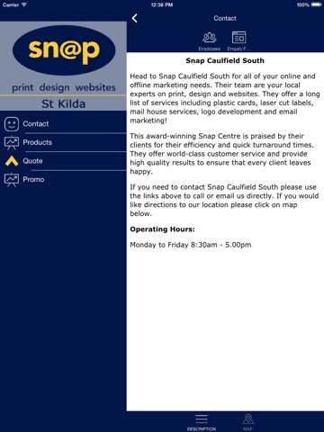 Connect with your local snap centre from the palm of your hand. Get a quote, browse products, view special offers, receive updates about in-store events and more. Snap St Kilda app makes it easy to keep up to date with your online and offline marketing needs from wherever you are.