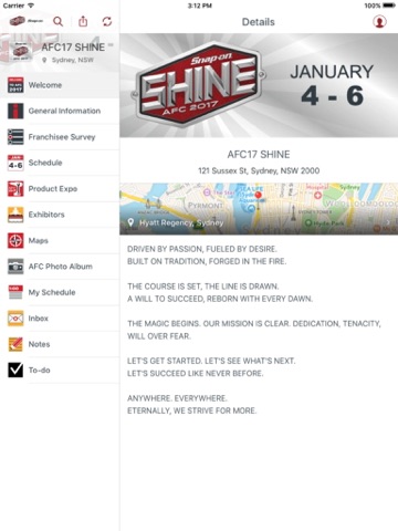This is the official event app for Snap-on Tools AFC17. The three day event will be an opportunity for you to discover new tool and equipment releases; you will have the chance to view presentations which will provide you with an insight to the most effective tools for growing your business in 2017. This trade exhibition style event is exclusive to you and your families. The conference will also introduce you to the wider Snap-on network.