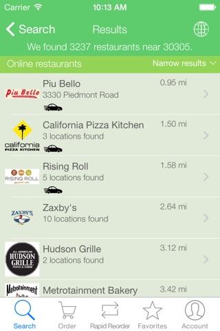 Theres no need to wait in line to satisfy your appetite when you can order for free using Snapfinger! Whether you want to pick it up yourself or get it delivered right to your door, you can order food from popular restaurants including California Pizza Kitchen, Bob Evans, Boston Market, Macaroni Grill, McAlister’s Deli, Outback, Zaxby’s, Subway and thousands more! Weve got restaurants for you in over 2,500 cities including San Francisco, Los Angeles, Atlanta, Las Vegas, San Diego, & Houston.