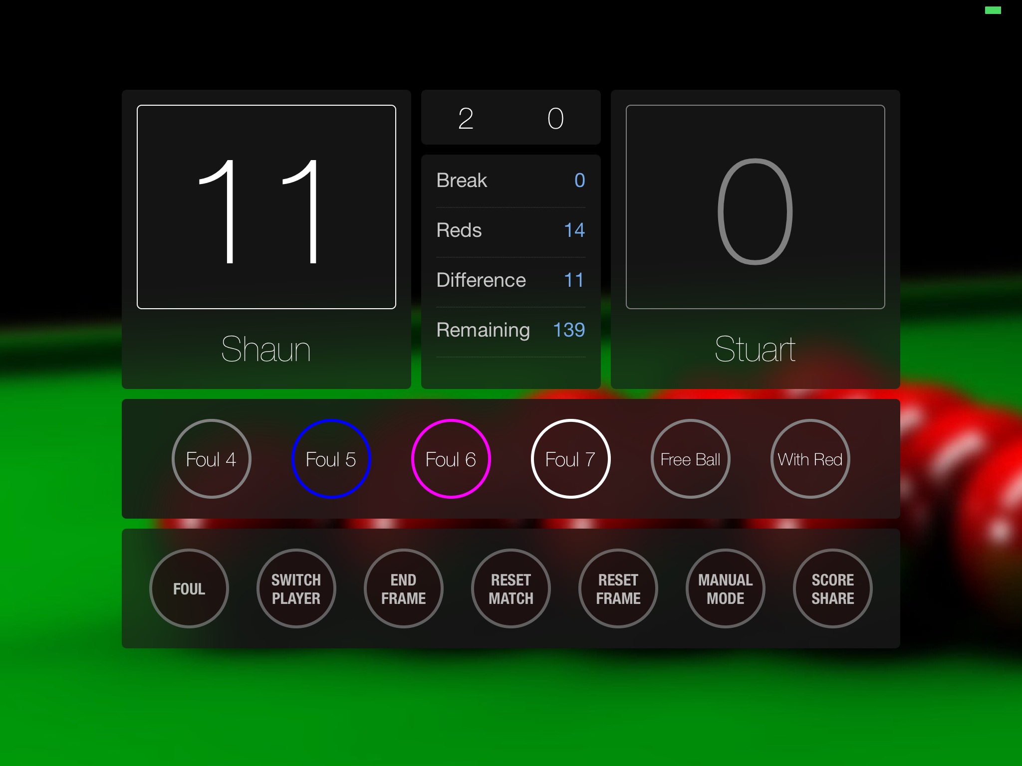 - manual mode - adjust you score, frames or amount of reds left