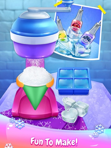 Start from making the ice cubes. You can choose the ice shapes you like. Play a puzzle game to win your snow cone shape. Its so fun to design your own cones with tons of colors, stickers, and even you can draw whatever you like on your cone. What a nice creation. Want to have sweet yummy syrups? They are freezed by the ice. Use the brush and the hammer to get them out. Choose between multiple flavors and put it with ice. Decorate it with fruity toppings, sprinkles, sweet candies and other tasty things. Finally, Choose a place to enjoy your yummy frozen dessert. Wow, look at the creation you made, you are a talented frozen food chef now. Show your yummy icy snow cone to your best friends.
