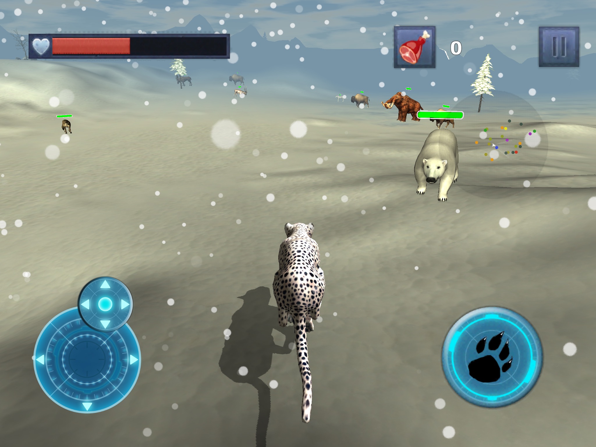 Control this fast and hungry Snow Leopard Eagle as he races across this massive open world snow terrain. Battle against Mammoth, Bears, Rabbits, Moose, and Wolves. Help him grow from a weak cat into a strong Snow Leopard. Hunt down your natural enemies in a quest to become the best. Thrive in this harsh Arctic environment.